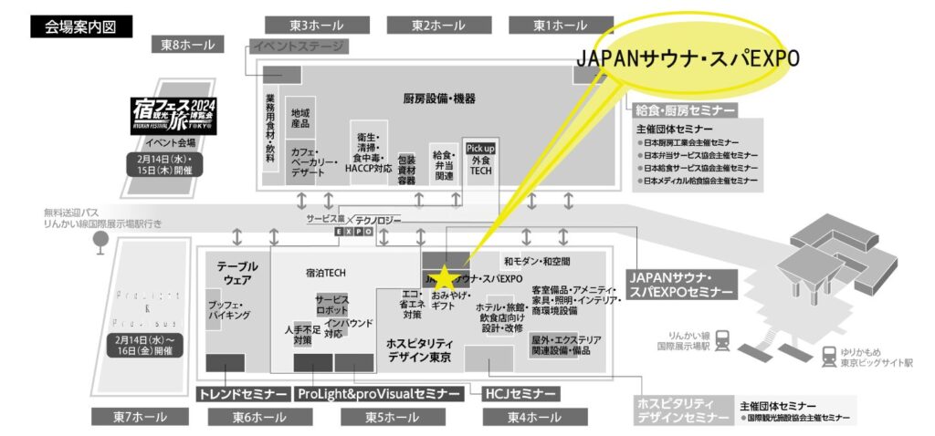 SAUNAGEは東5ホールの出入り口から入っていただくと、JAPANサウナ・スパセミナーの近くに出展しております。