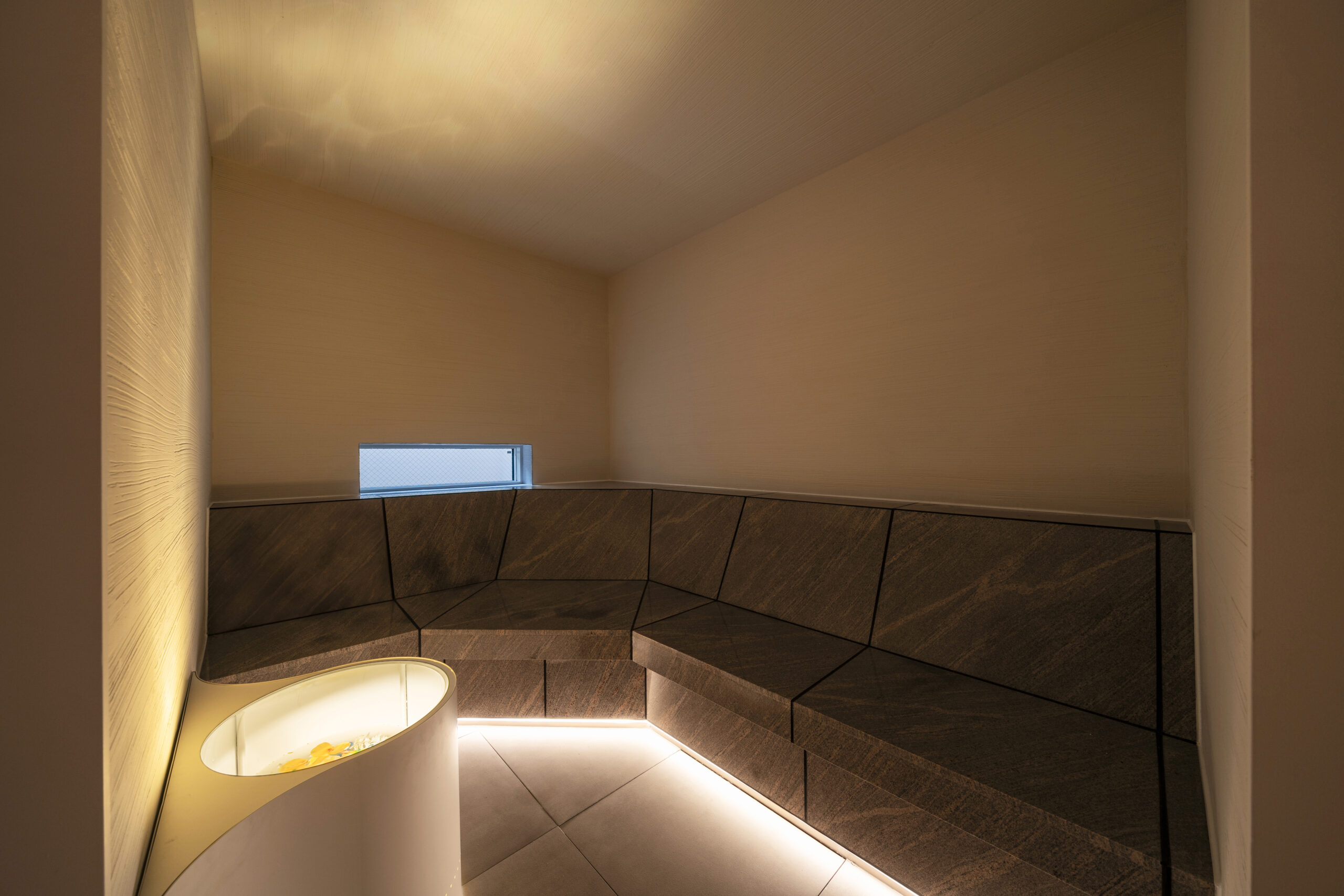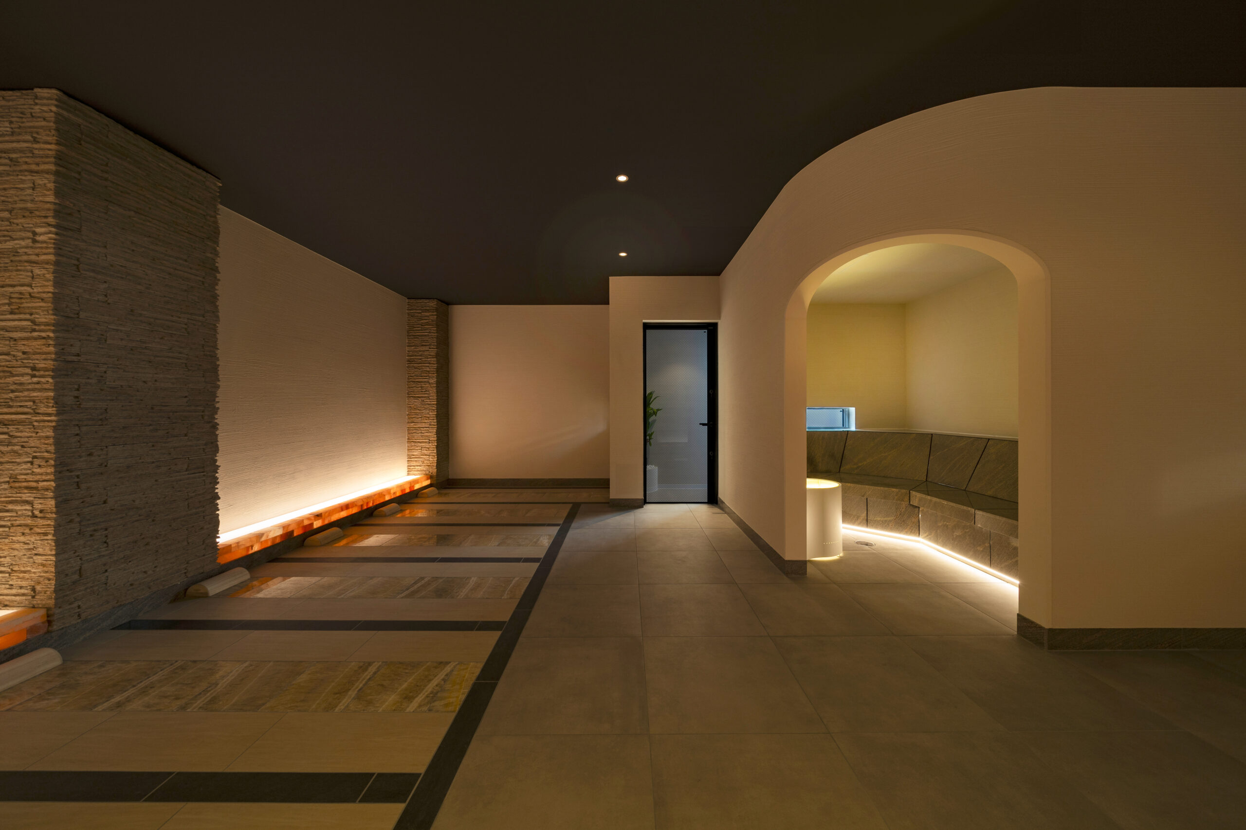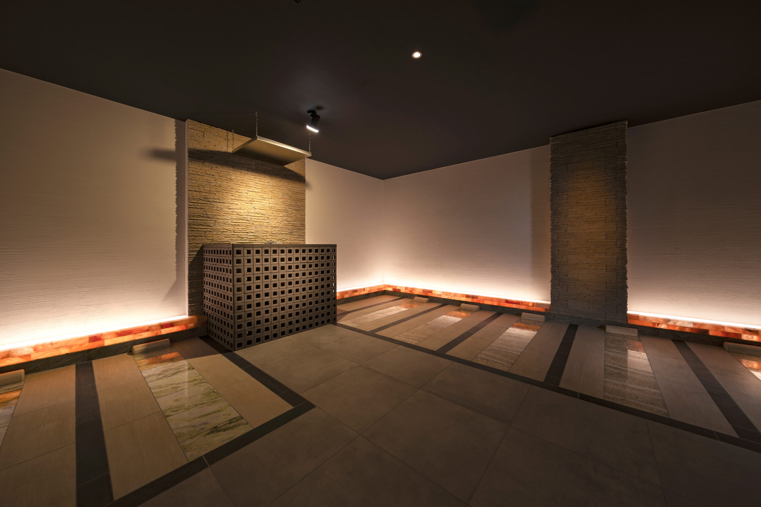 洞窟の岩盤浴には、良い香りを感じられる香温浴、また壁面と天井面に水紋が拡がる仕掛けづくりを施してあり、五感で体感頂ける岩盤浴となっております。