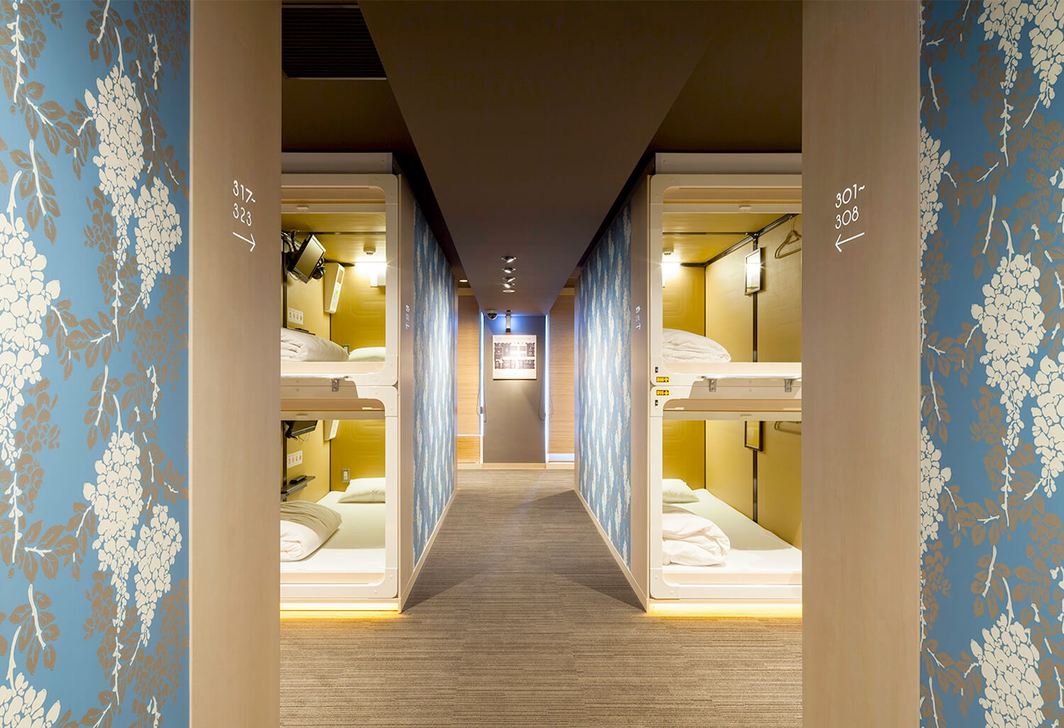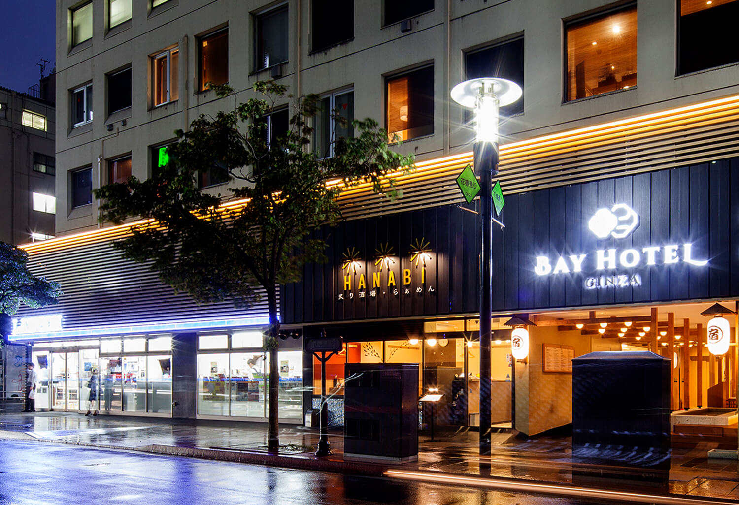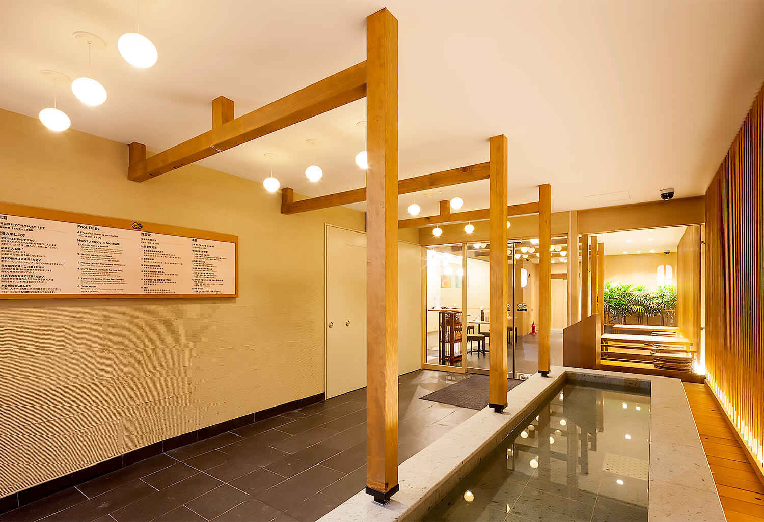 病院だったビルを全改装。銀座初となる大規模なカプセルホテルです。 インバウンドと女性客の需要を意識した小粋な江戸風デザインでまとめ上げています。 エントランスファザードには、無料の足湯も設置されています。