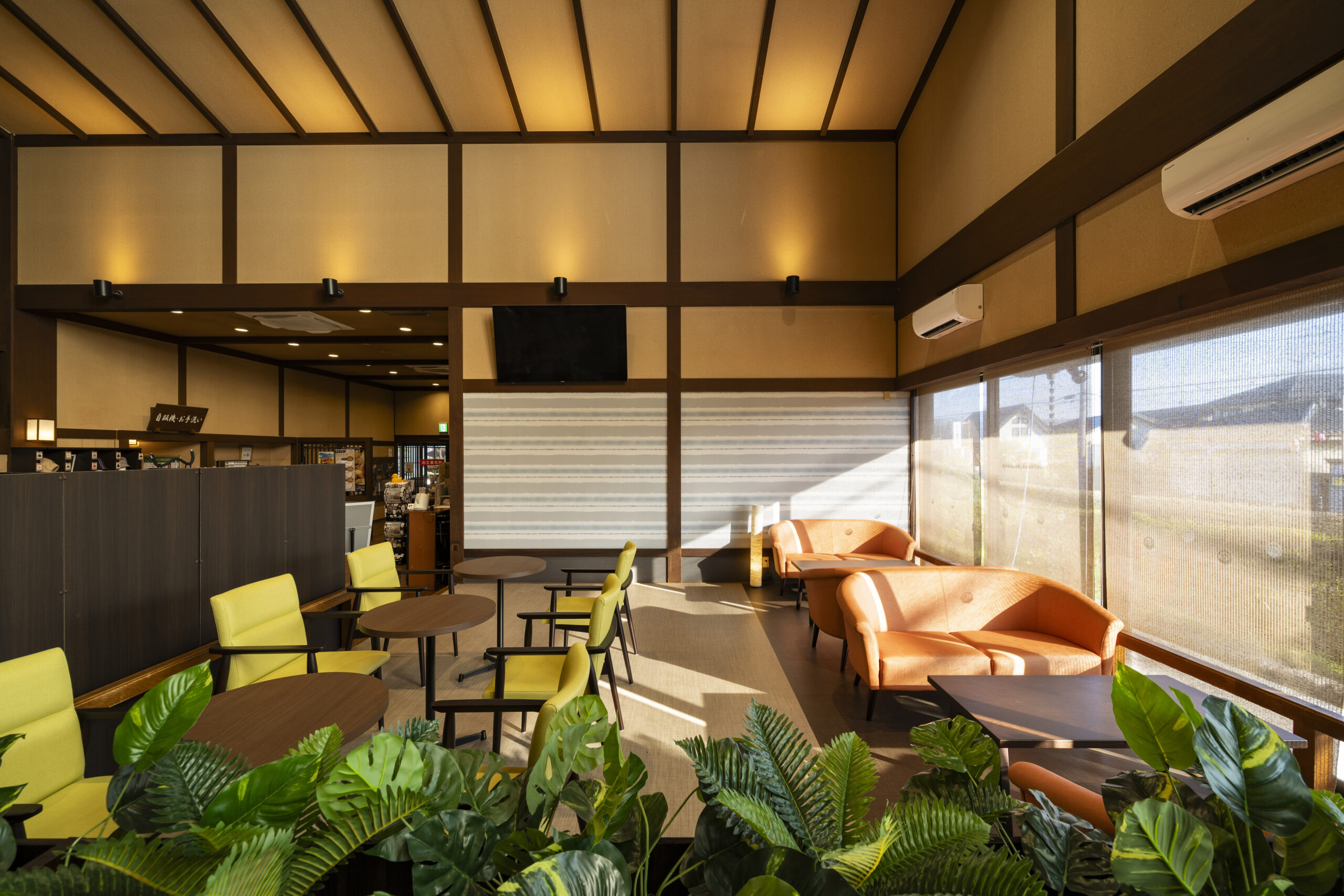休憩するスペースという目的は保ちつつ現状より明るく入りやすい空間にしたいとのご要望をいただき、既存の木目の色を生かしたラウンジのような落ち着いた空間をご提案させていただきました。現状より席数も増え、快適な空間にリニューアルできたと思います。