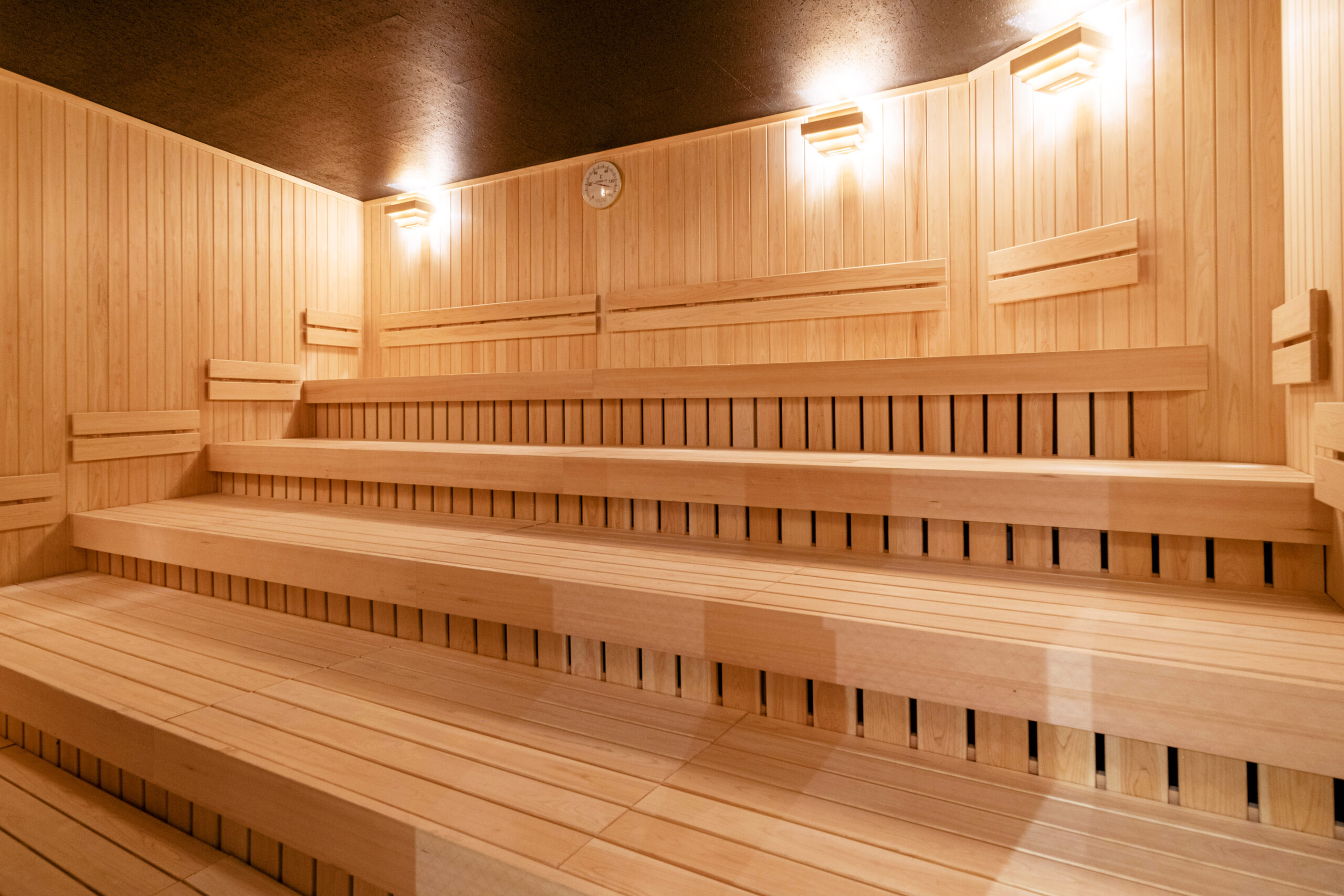 浴場には本格的なフィンランドサウナが。特に男性サウナ室は巨大で迫力があります。