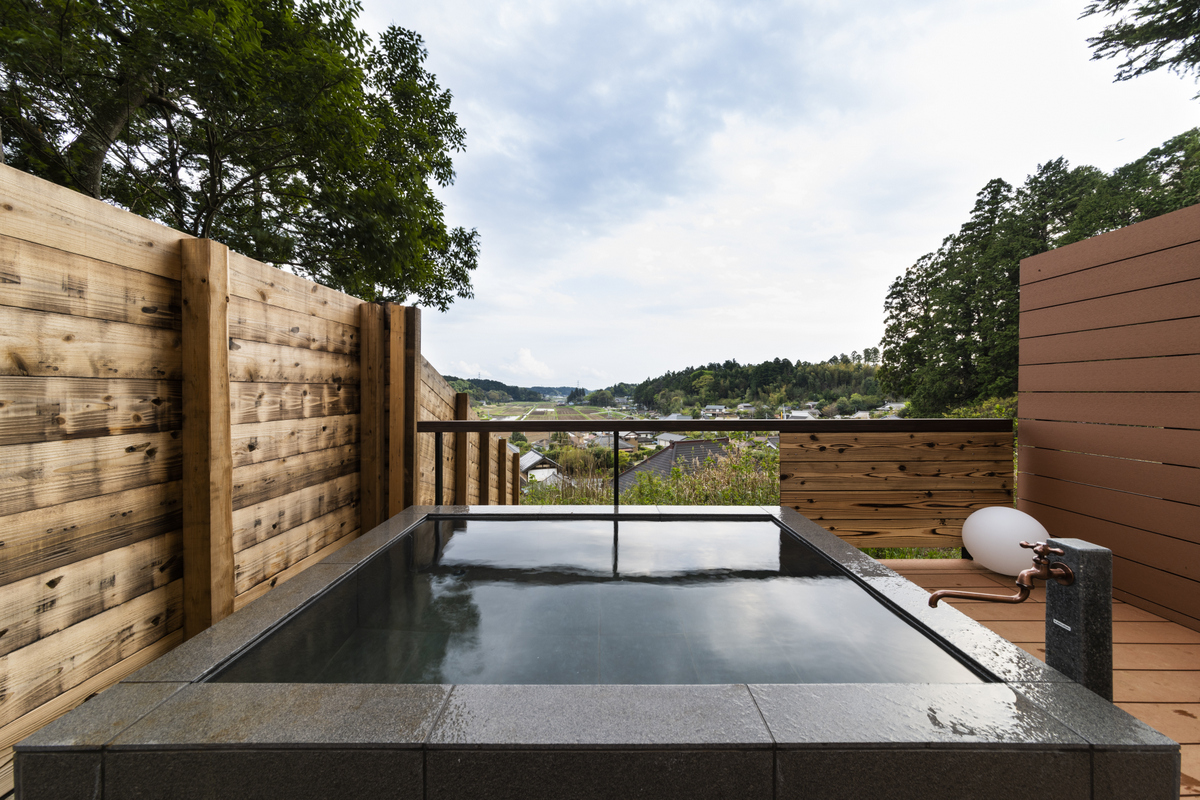 施設にはビジネスで利用できるよう、インターネットが使える寝室や和室などの5つの部屋と、プロジェクターやホワイトボードが備えられた蔵があるほか、露天風呂からはまちの田園風景が一望できます。
