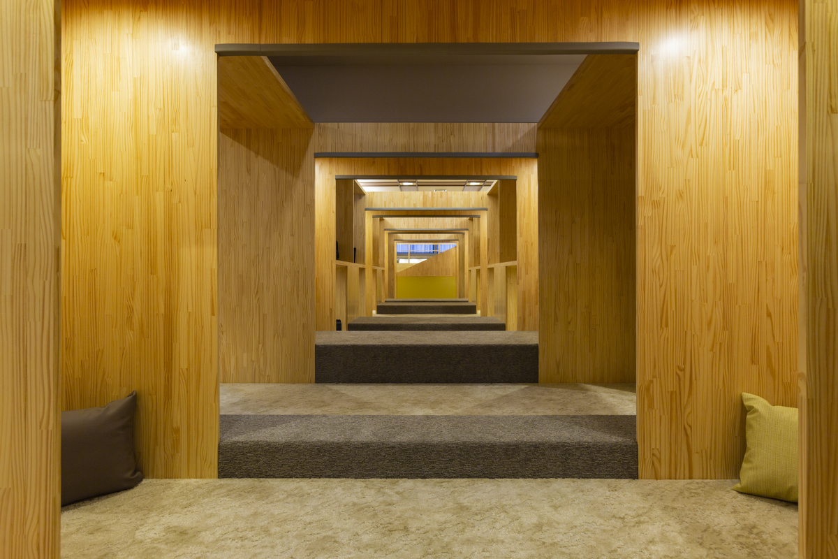 インパクトのあるトンネル小上がり造作、2階建てのソファシェルフ造作等、製作と打合せをして施工図を作成、工場で仮組して現場施工するなど現場での手間を減らし短納期で工事を完了させることができました。