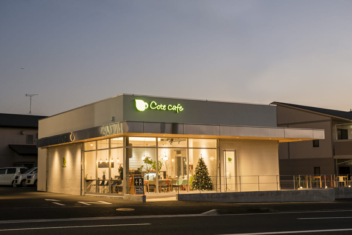 建築躯体から関わった新築店舗です。 鉄骨造のおおきな庇がシンプルな外装にアクセントを加えています。
