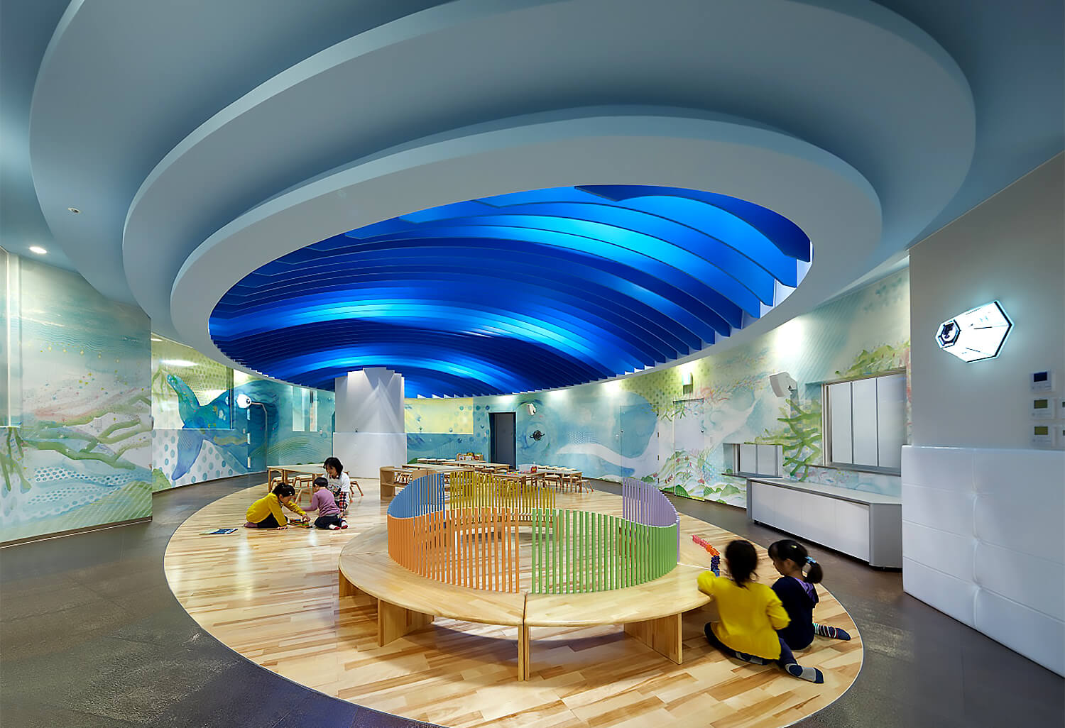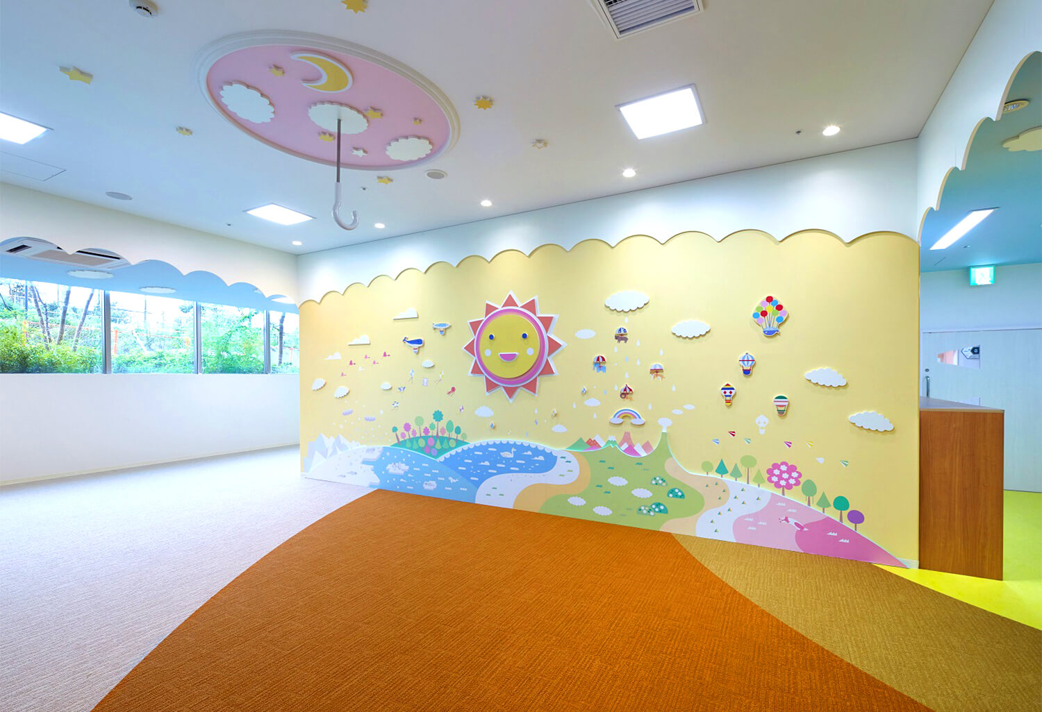 新宿区富久町(とみひさちょう)に定員164名という大規模の保育園の新装工事を設計調整段階から約2年間かけて完工いたしました。 小さな宇宙をテーマにして、所々に太陽・星・海・緑の自然を天井や壁・床に演出。 子供たちの夢を育む要素として、ひとつひとつ丁寧に創造しています。