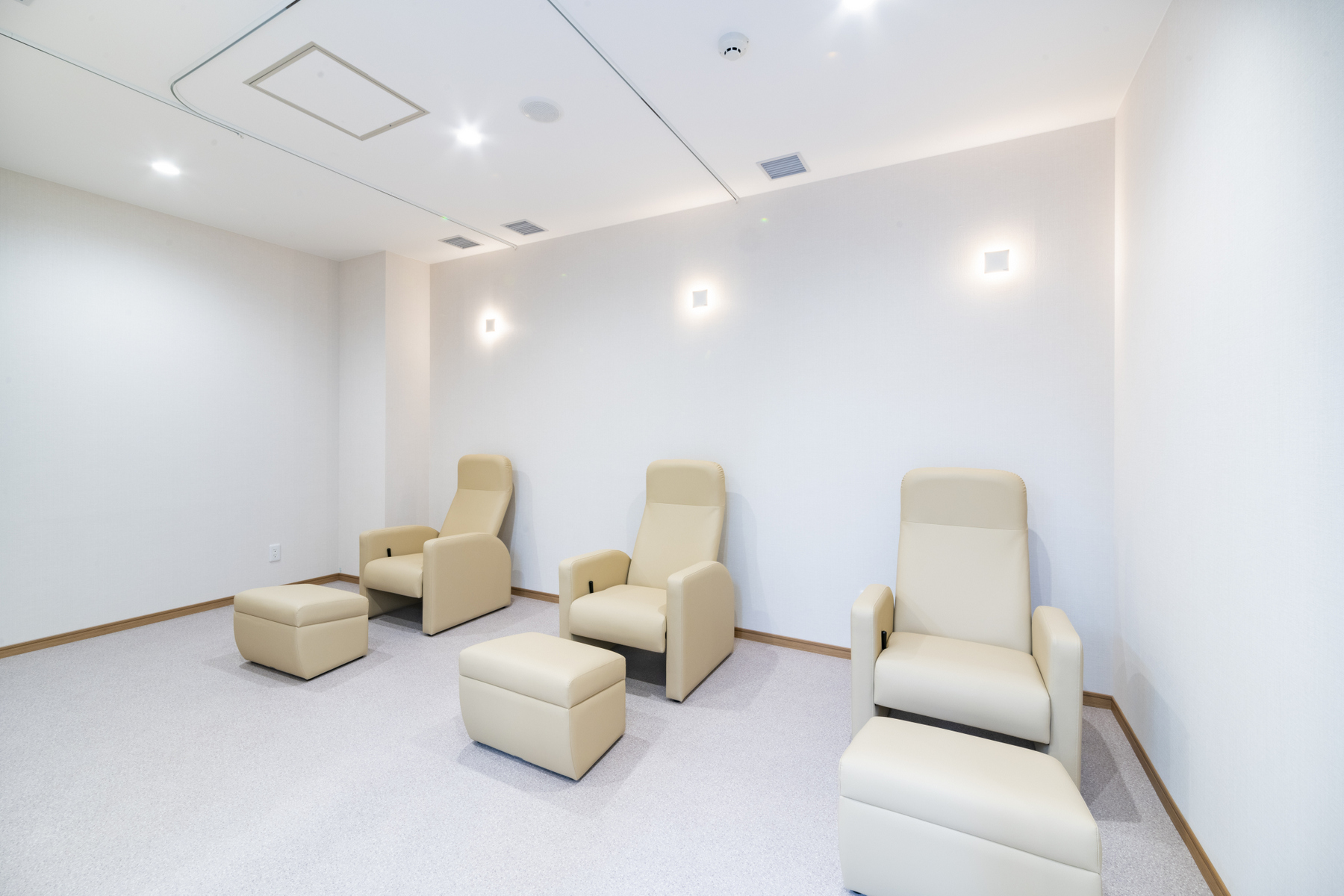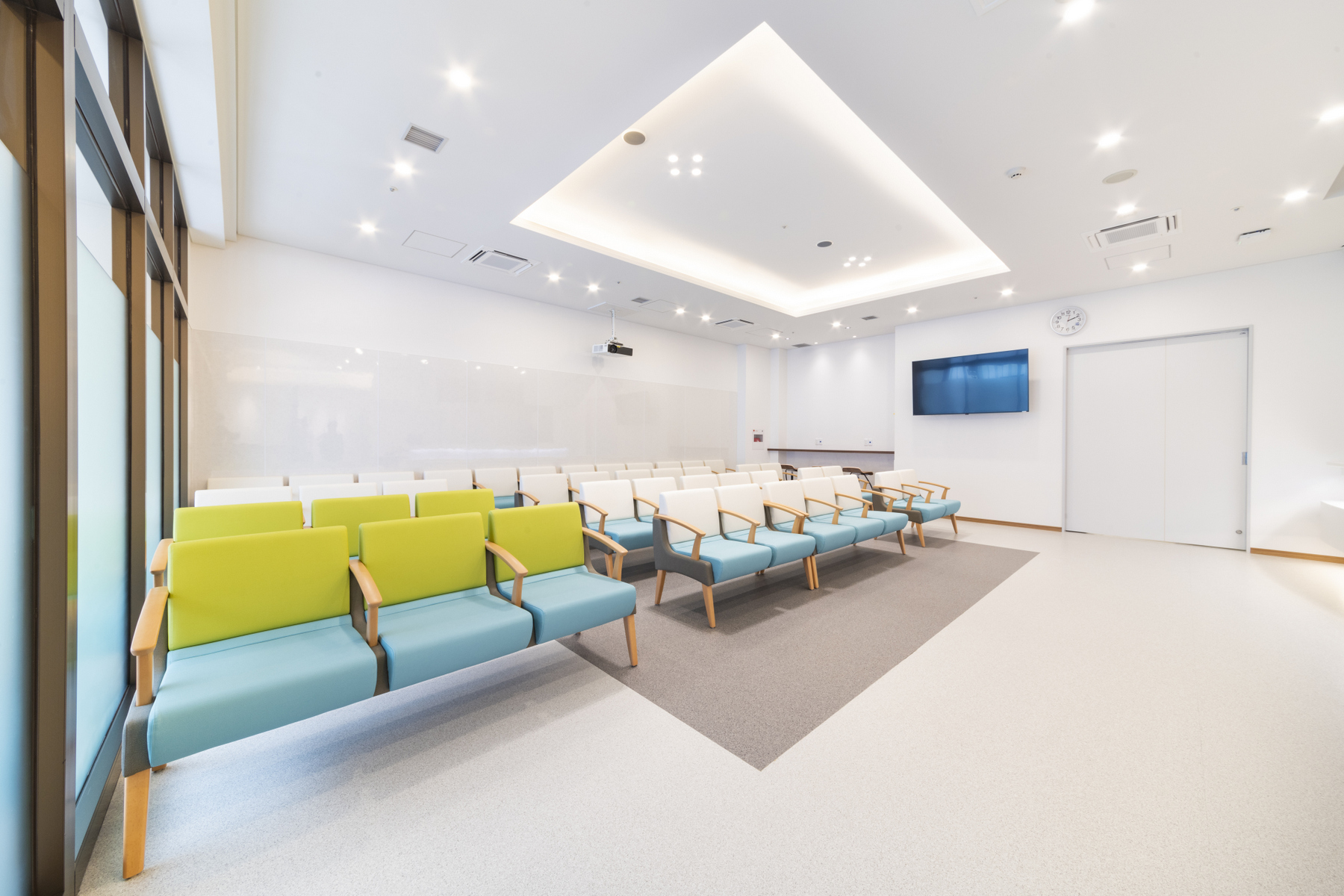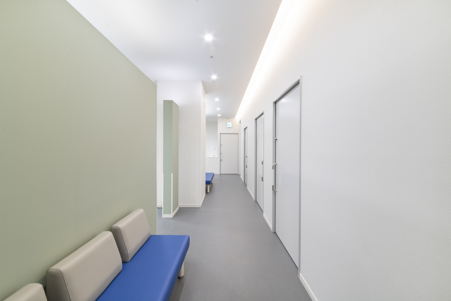 白を基調とした明るい内装ですが、時折アクセントカラーの仕上げを取り入れる事でデザイン性も高くなった印象です。ゆるやかなアールを描いた美しい受付、天井の高い解放感のある待合ホールが来院される患者様をお出迎えします。
