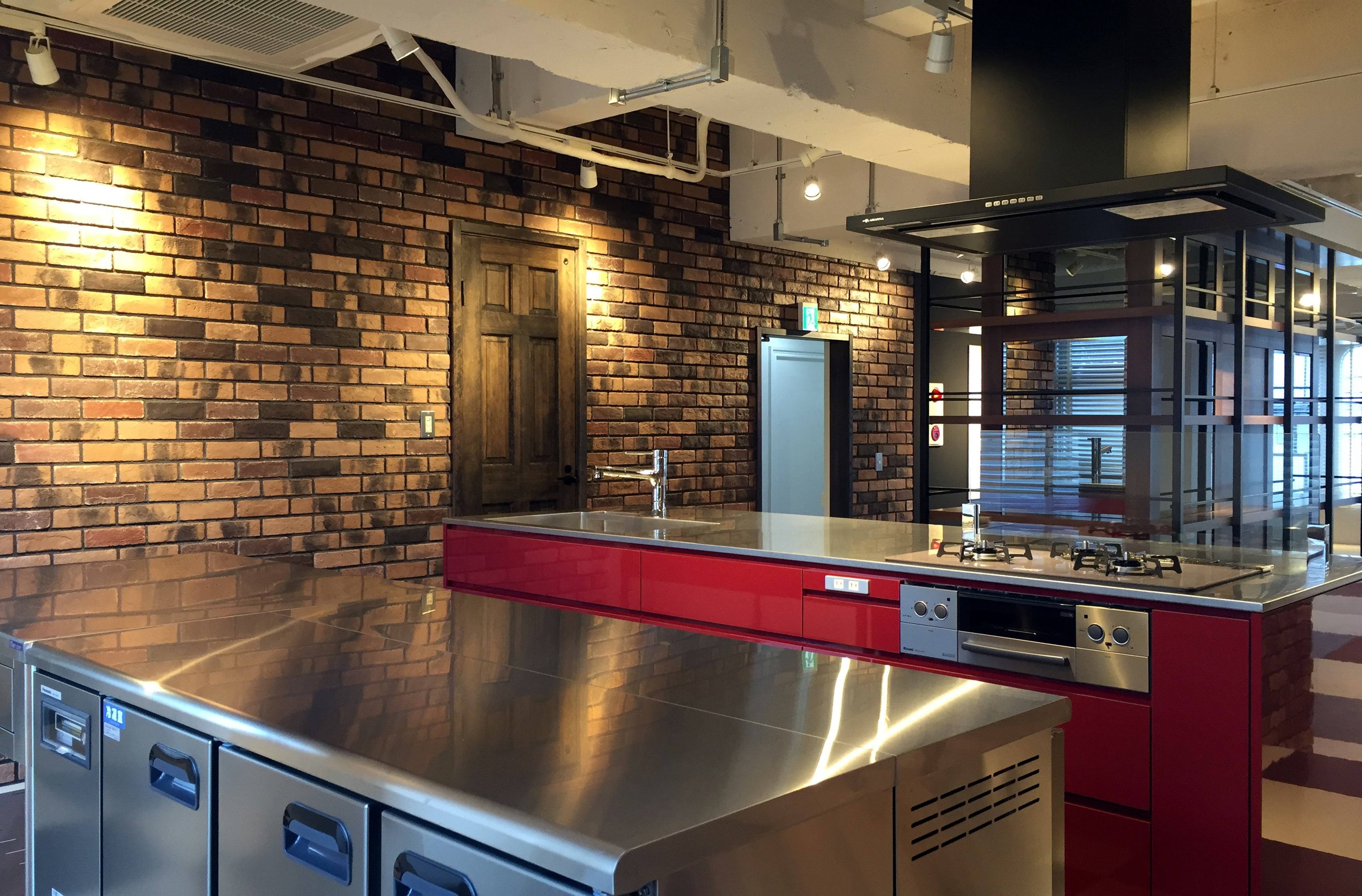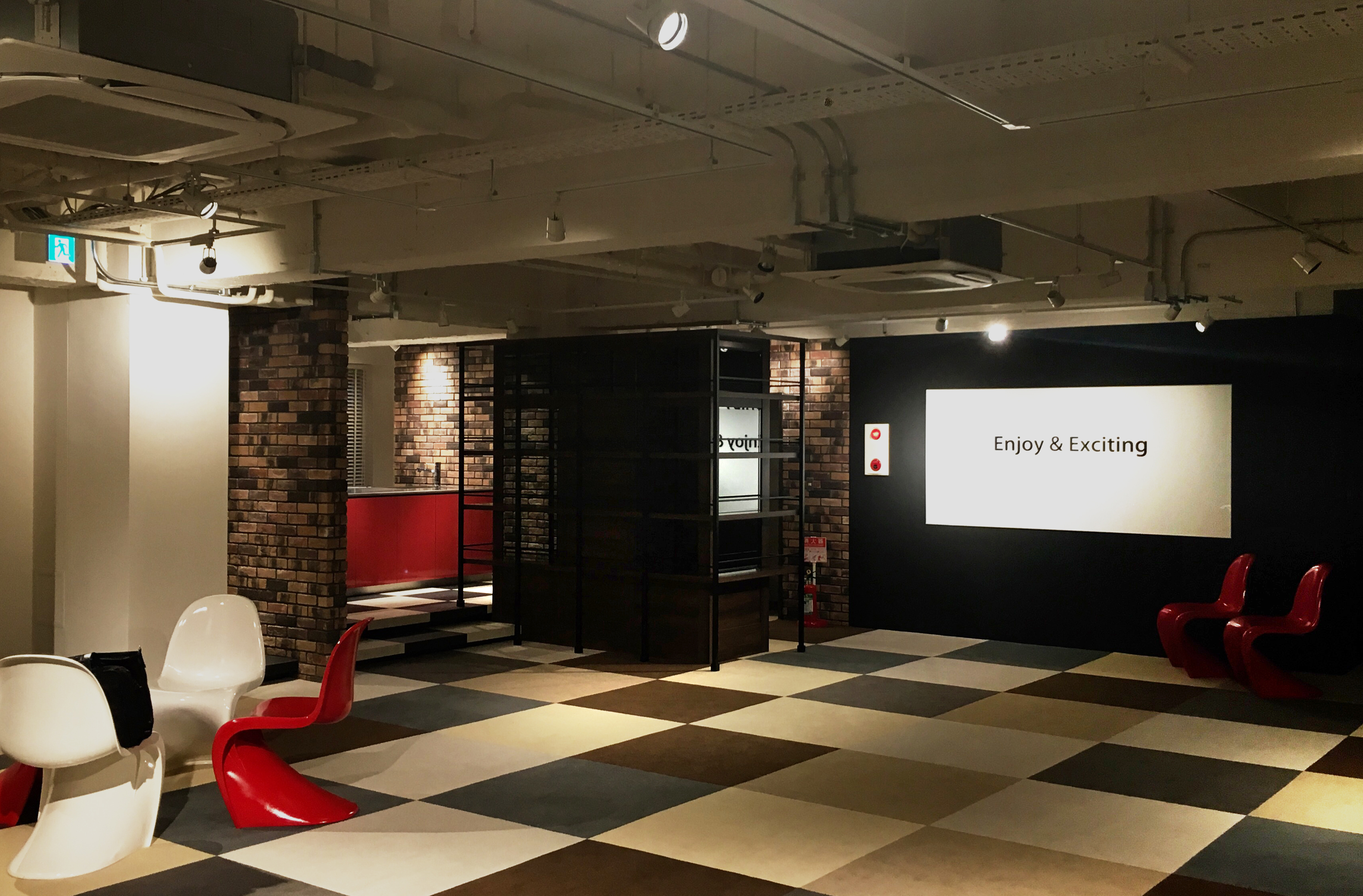 スケルトンからのオフィス計画。 キッチンとバーカウンター・ボトルラックをメインとした執務エリア。 作業時は10名未満。パーティーの時は60名収容可能な不思議な空間。