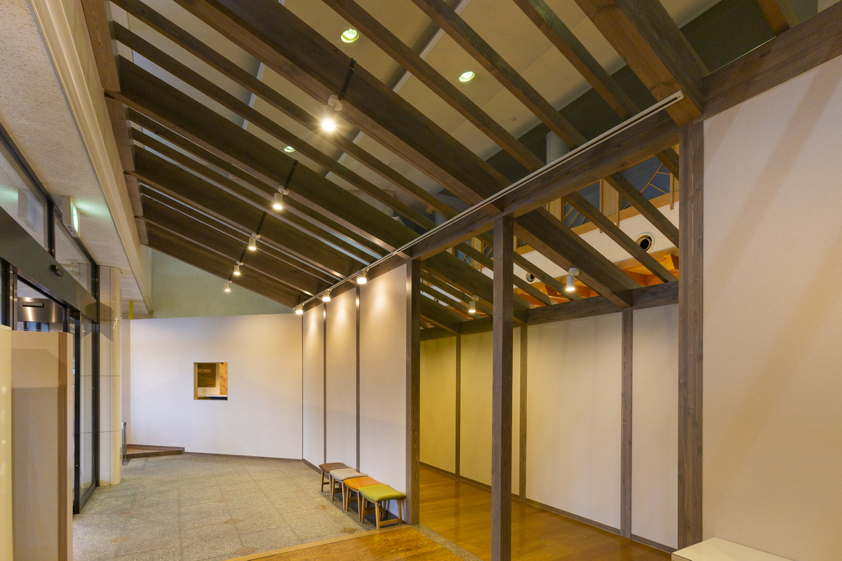 入退館システムの更新に伴い、新たにお客様の導線を設ける工事を致しました。エントランスに迫力のあるヤグラ造作を組み、温泉から出た後ゆっくりくつろげるスペースも改装しデザイン性もあり落ち着く空間となりました。