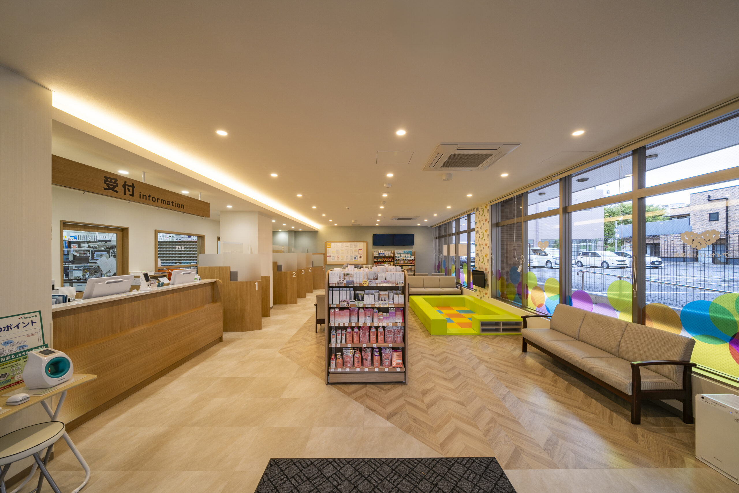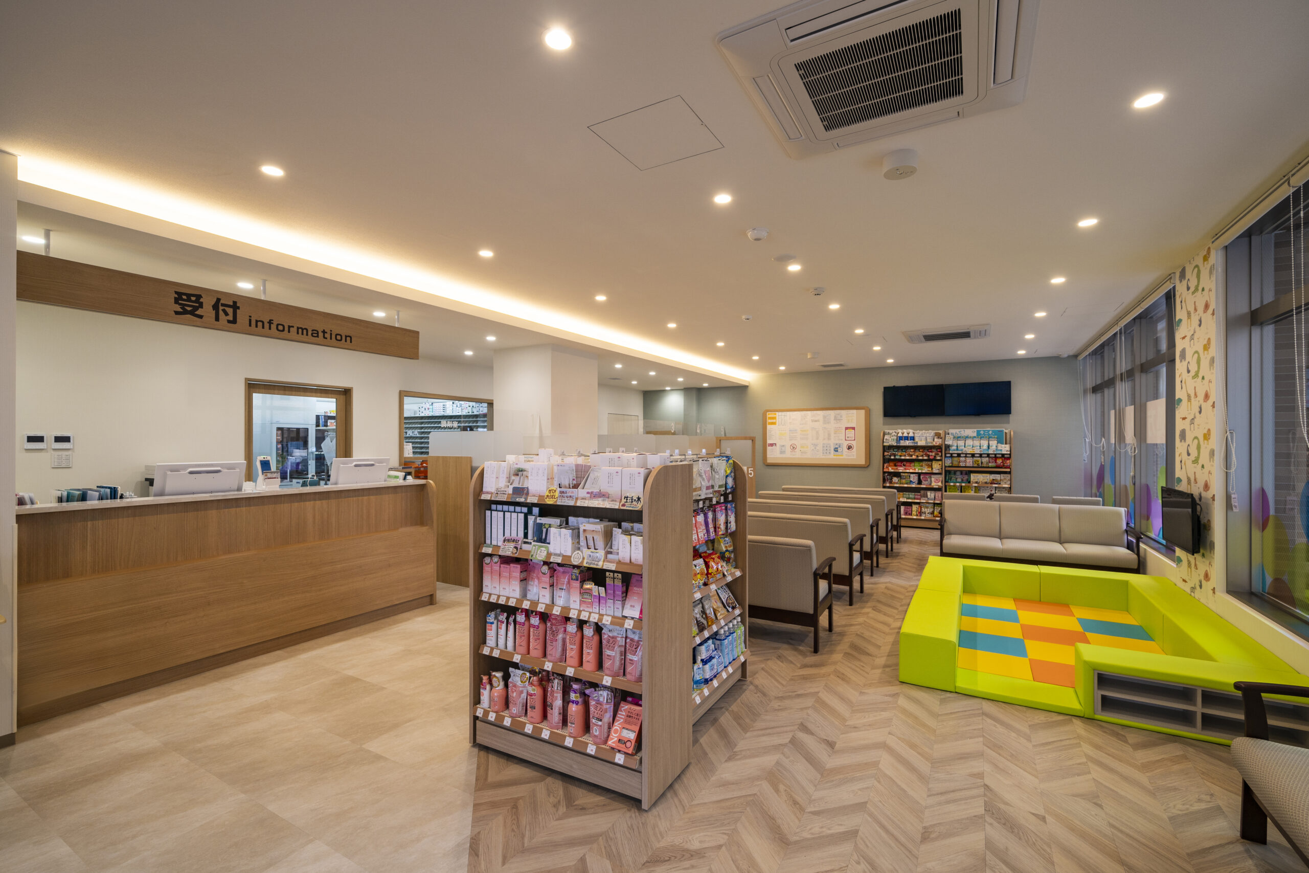 開放的な室内にはキッズルームや充実した商品販売台、待合スペースなどがあります。また患者様に必要となる情報も情報ボードを設けわかりやすく掲示しています。