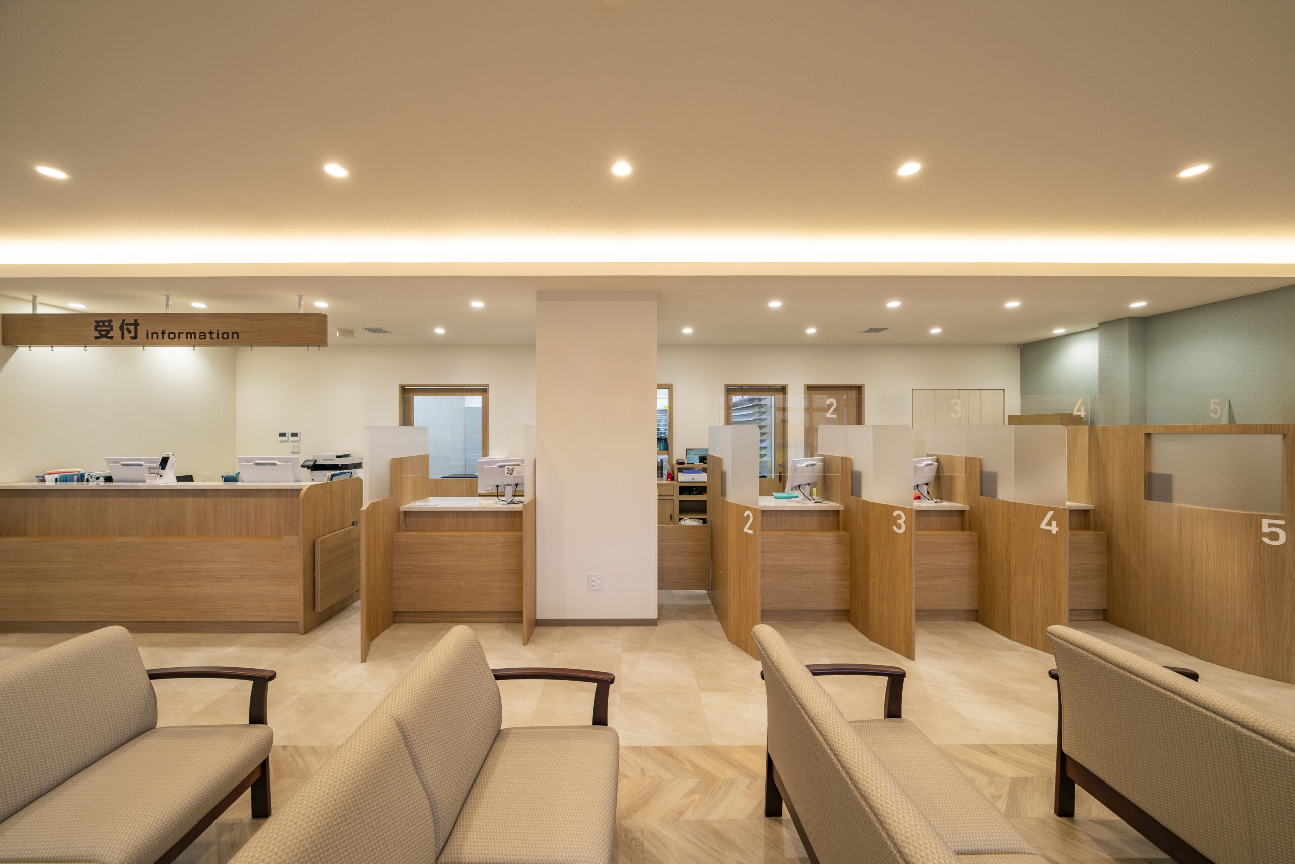 新築医療モールのテナント工事として設計施工で入らせていただきました。お客様のデザインチームで仕上げなど選定していただき、それをバランスよく形にしていくのが弊社の仕事となります。過去にも実績のある案件ですので、同チームを組んでスムーズに取り組ませていただきました。