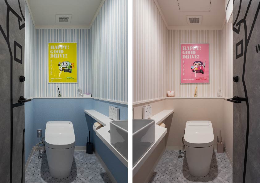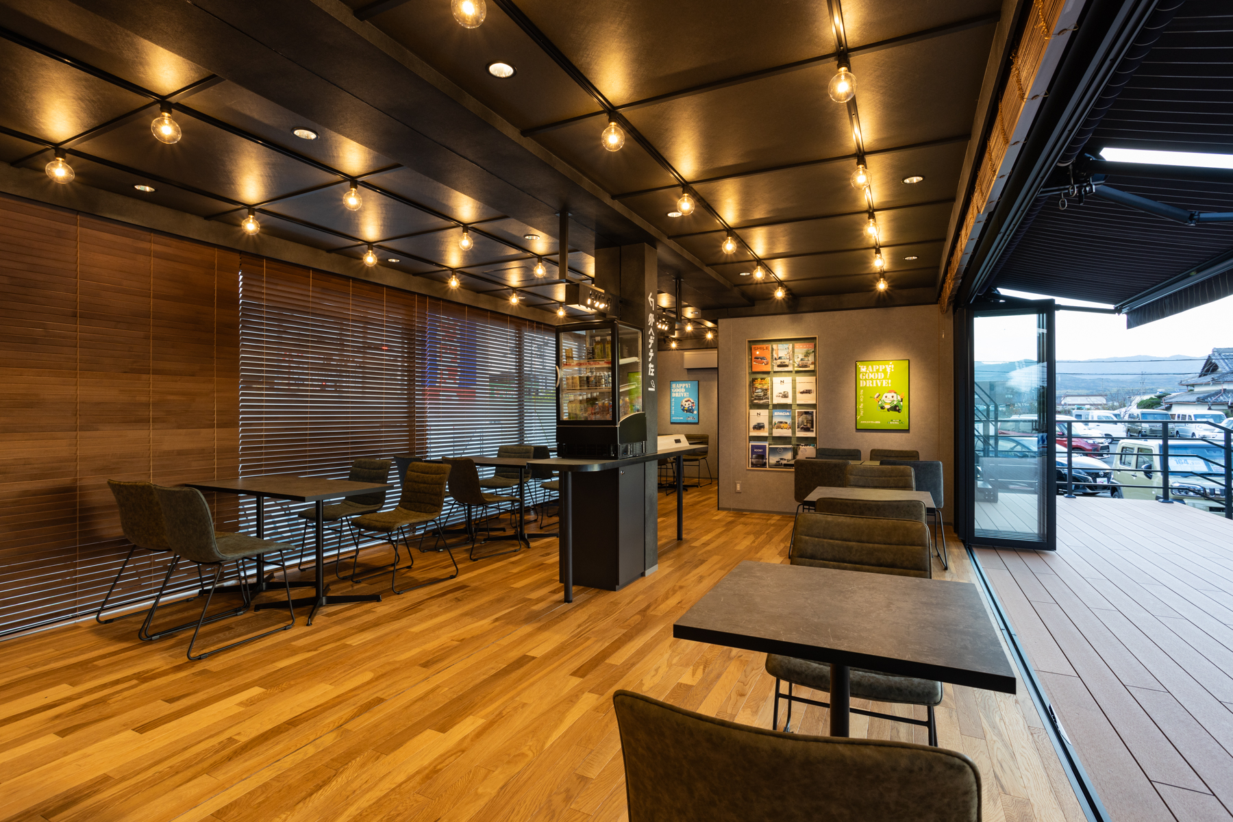 「車販売店らしくないものにして欲しい」というのがお客様の要望でした。外観は照明のキラキラ感を出し、室内はゆったり落ち着ける空間にしました。車販売の特性上、外の展示場と中の商談スペースを行き来するので、前面を全開放の折れ戸を設置し、外はウッドデッキと人工芝を敷設することで、中でも外でも楽しんでもらえるようにしました。車屋さんらしくない素敵な可動建物が出来たかと思います。