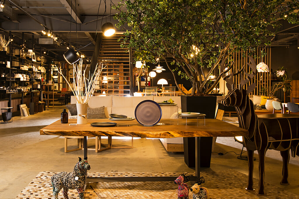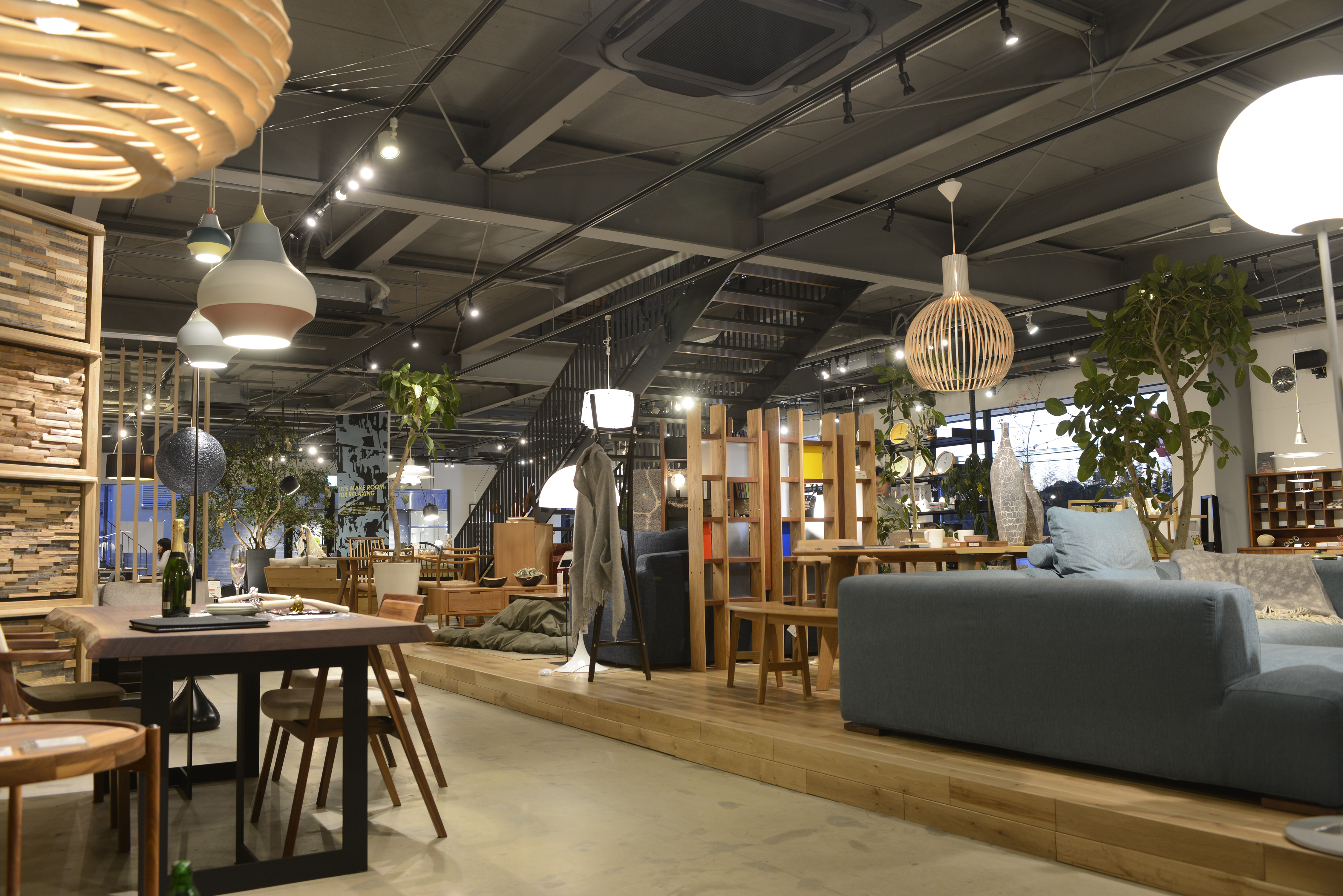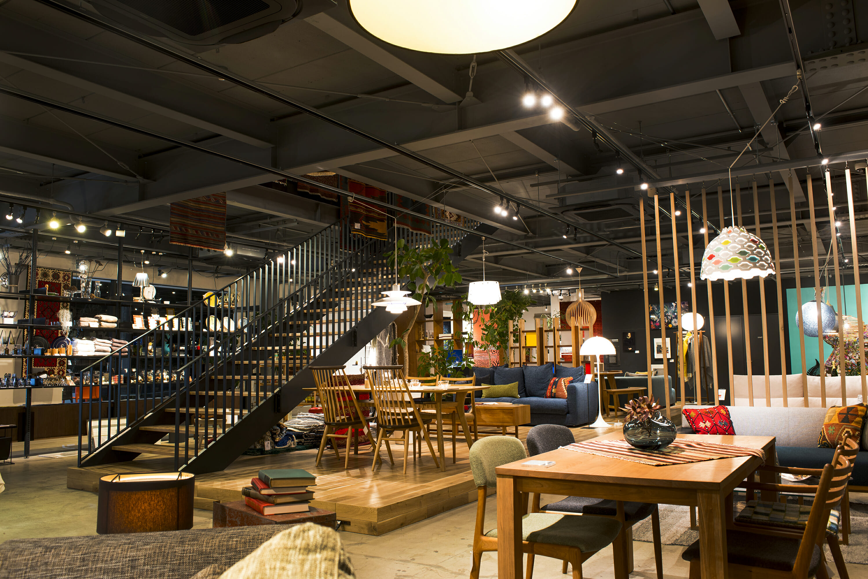 移転による店舗拡大プロジェクト。 店舗の中心に鉄骨階段を新設し、大きな吹き抜け空間を設けました。